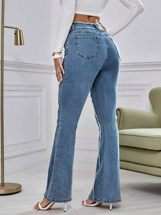 Essnce Women Casual Fringed Denim Flared Pants, Versatile For Autumn