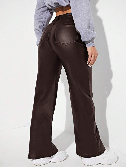 MOOSTA Women Plain Color PU Leather Pocket Straight Loose Pants